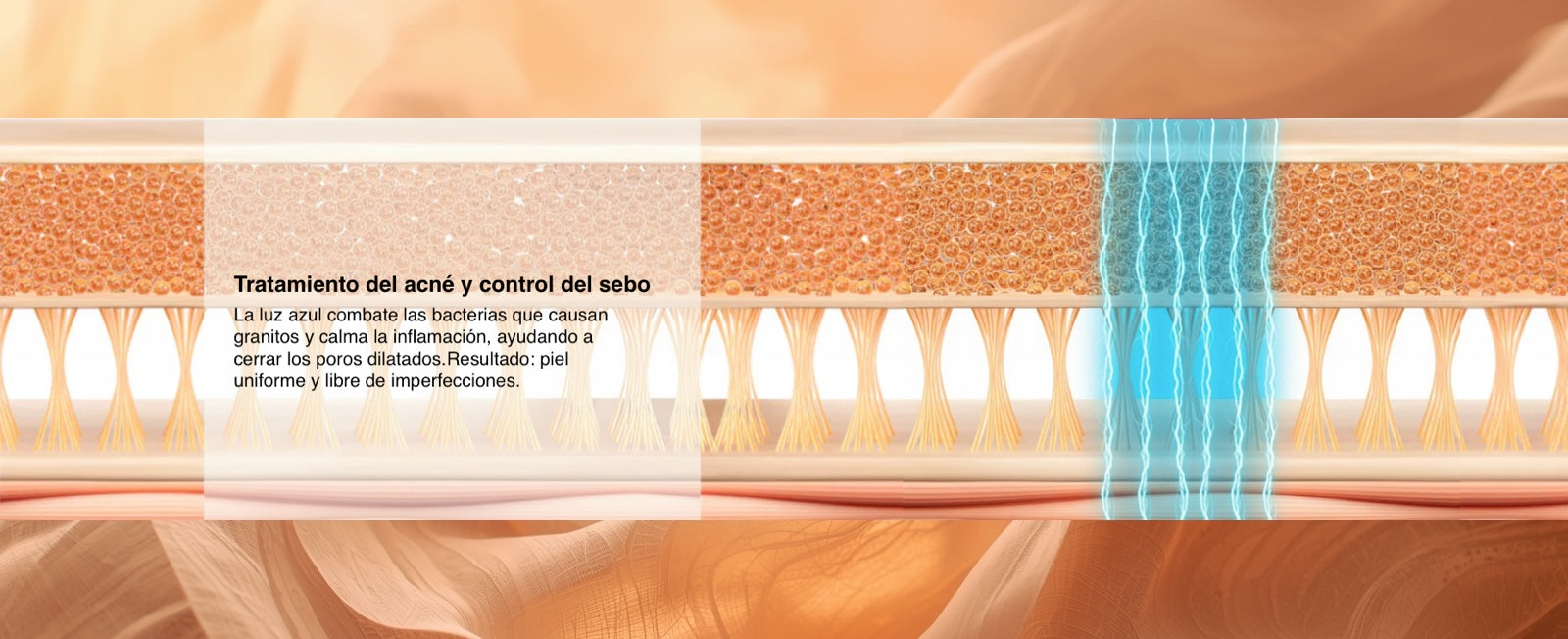 🔵 La luz azul combate las bacterias que causan granitos y calma la inflamación, ayudando a cerrar los poros dilatados.