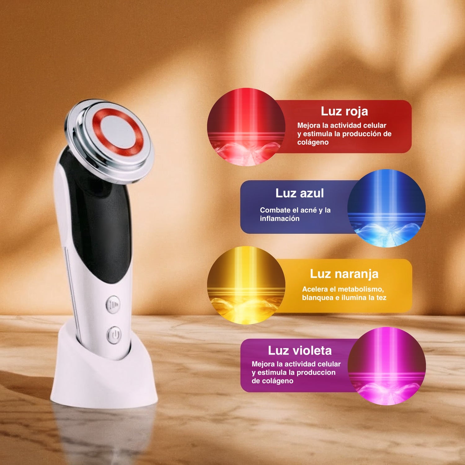 🟣 La luz violeta/rosa combina calor, ionización y microcorrientes juntas para mejorar la penetración de sueros y cremas.
