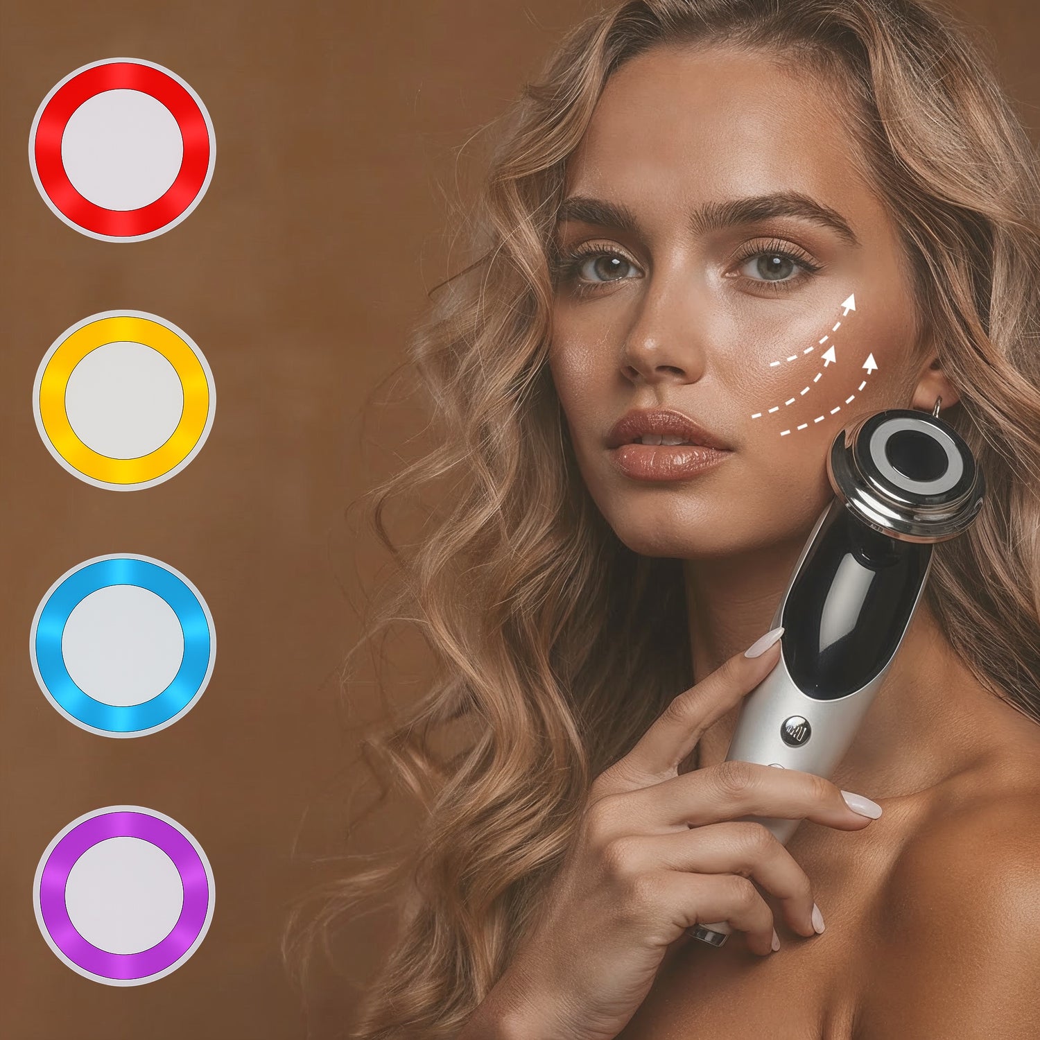 Con 7 FUNCIONES DIFERENTES Y 3 VELOCIDADES: microcorrientes EMS, luz LED, calor iónico y vibración inteligente, este dispositivo activa la regeneración celular y restaura la firmeza y luminosidad natural de tu piel.